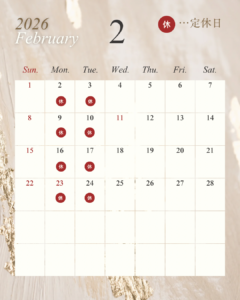 2月定休日のご案内 2025.05.30 2026.01.25 定休日 2月定休日のお知らせです。まだまだ寒い日が続きますので、体調にはお気をつけください♪ 【残りわずか】2026年1月の空席情報について 次の記事